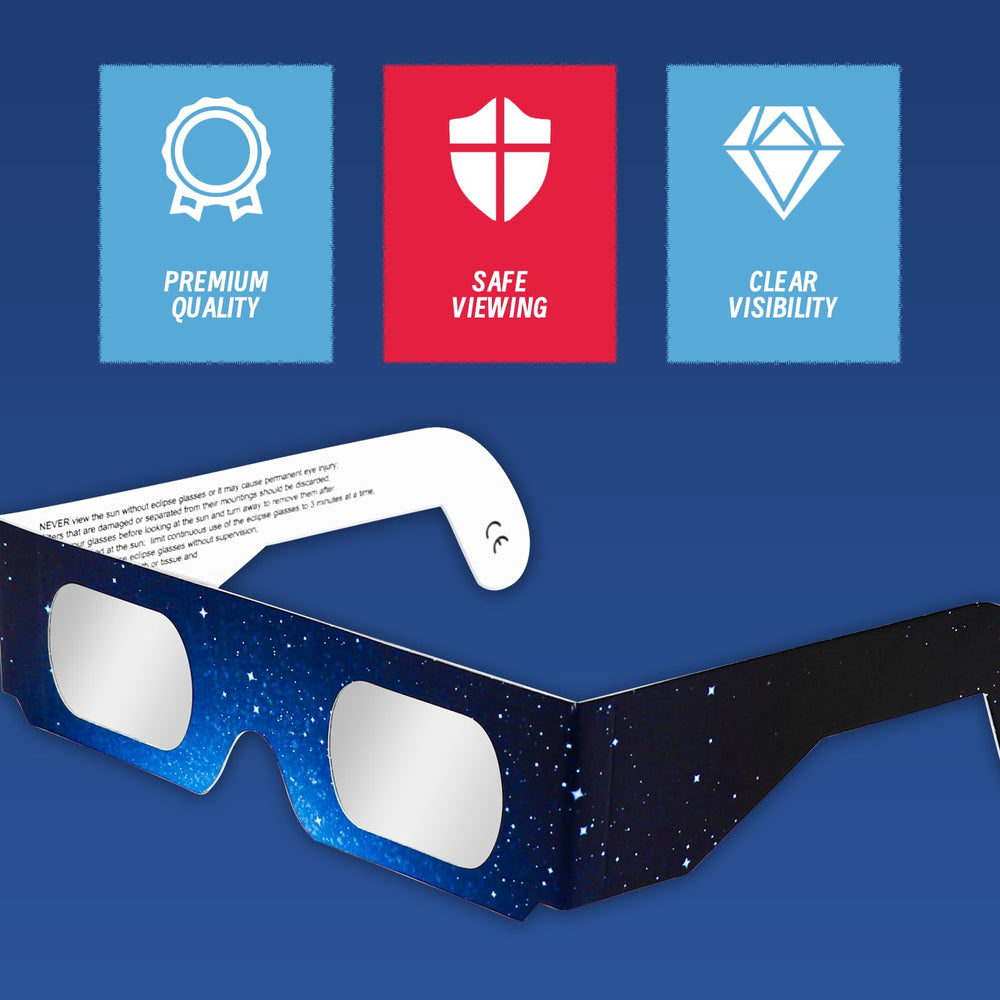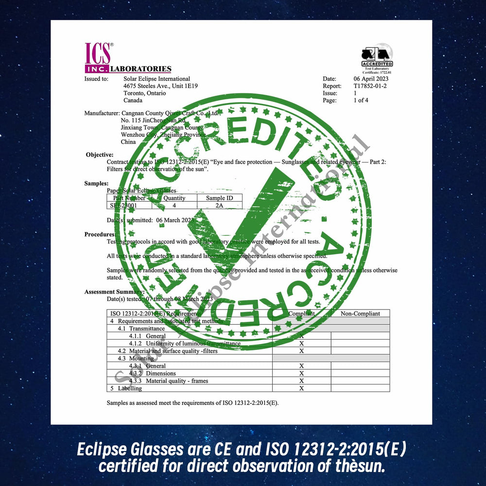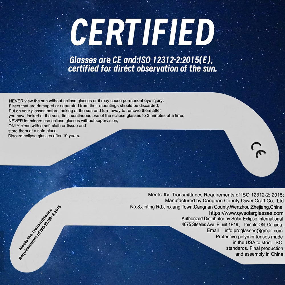 Blocks 100% harmful ultraviolet (UV) and infrared (IR) rays with ISO 12312-2 certified lenses – independently tested by European Optical Safety Institute. Never view the sun with regular sunglasses!